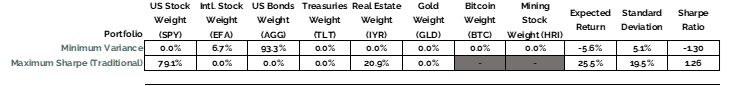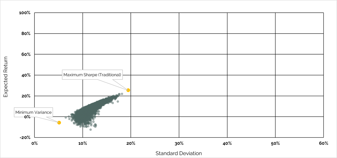 The two “corner” portfolios highlighted are the minimum variance portfolio, and the maximum Sharpe portfolio. The minimum variance portfolio is the combination of assets that would result in the minimum level of risk possible given the universe of investment options. The maximum Sharpe portfolio is the most optimal portfolio that sits along the Efficient Frontier. It maximizes the ratio of expected return to risk given the universe of investment options.