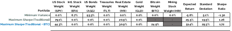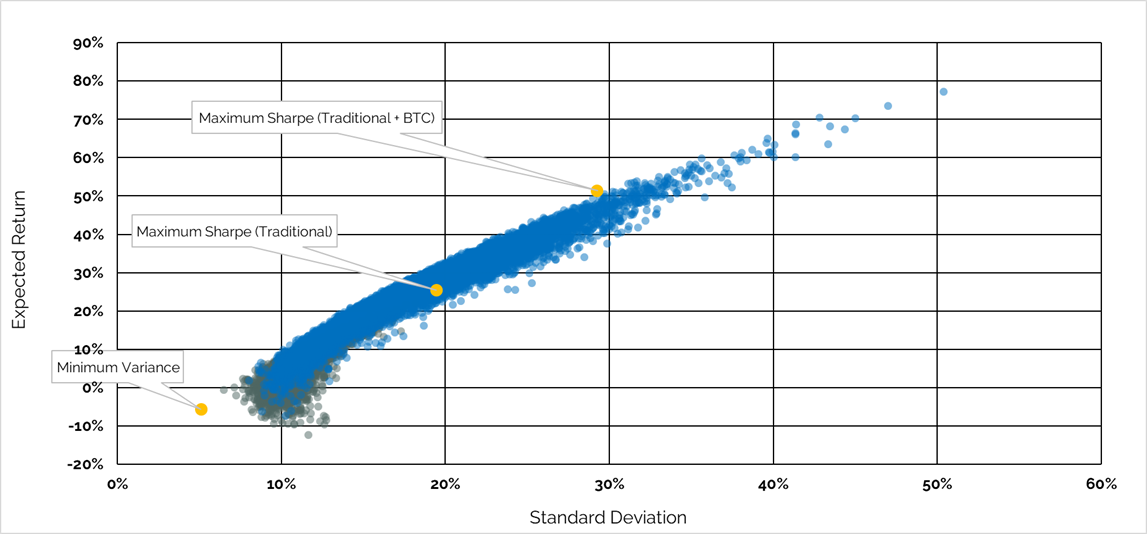 But what happens when Bitcoin is introduced? The “traditional + BTC” scatterplot, shaded in blue, elongates as additional risk enters the universe, but more importantly the Efficient Frontier shifts “northwest”, meaning the efficient portfolio at every level of risk is improved with an allocation to Bitcoin!
