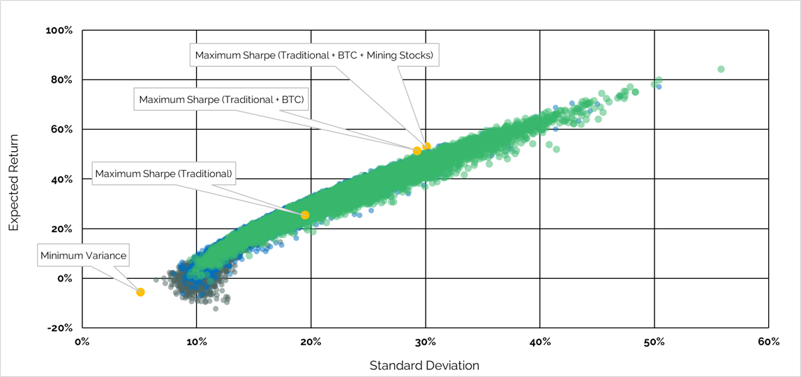 We can expand this new universe one step further by adding Bitcoin’s most closely related equities, Bitcoin mining stocks, as represented by the Hashrate Index Crypto Mining Stock Index. The scatterplot of the final “traditional + BTC + mining stocks” universe, shaded in green, again improves at almost all levels of assumed risk as the addition of Bitcoin mining stocks further enhances the opportunity set.