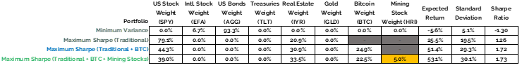 One of the most common criticisms surrounding Bitcoin mining stocks is that, given their obvious business exposure to the price of Bitcoin, they are nothing more than Bitcoin proxies trading on the stock exchange. As demonstrated in this analysis, the reality is much more complex. While it is true that Bitcoin mining stocks have a very strong correlation to the price of Bitcoin, they can offer more utility to an investor than simply serving as a proxy. Their additional diversity of risk and return drivers can enhance portfolios. The maximum Sharpe portfolio calls for an allocation to Bitcoin mining stocks, even when to universe includes Bitcoin itself!