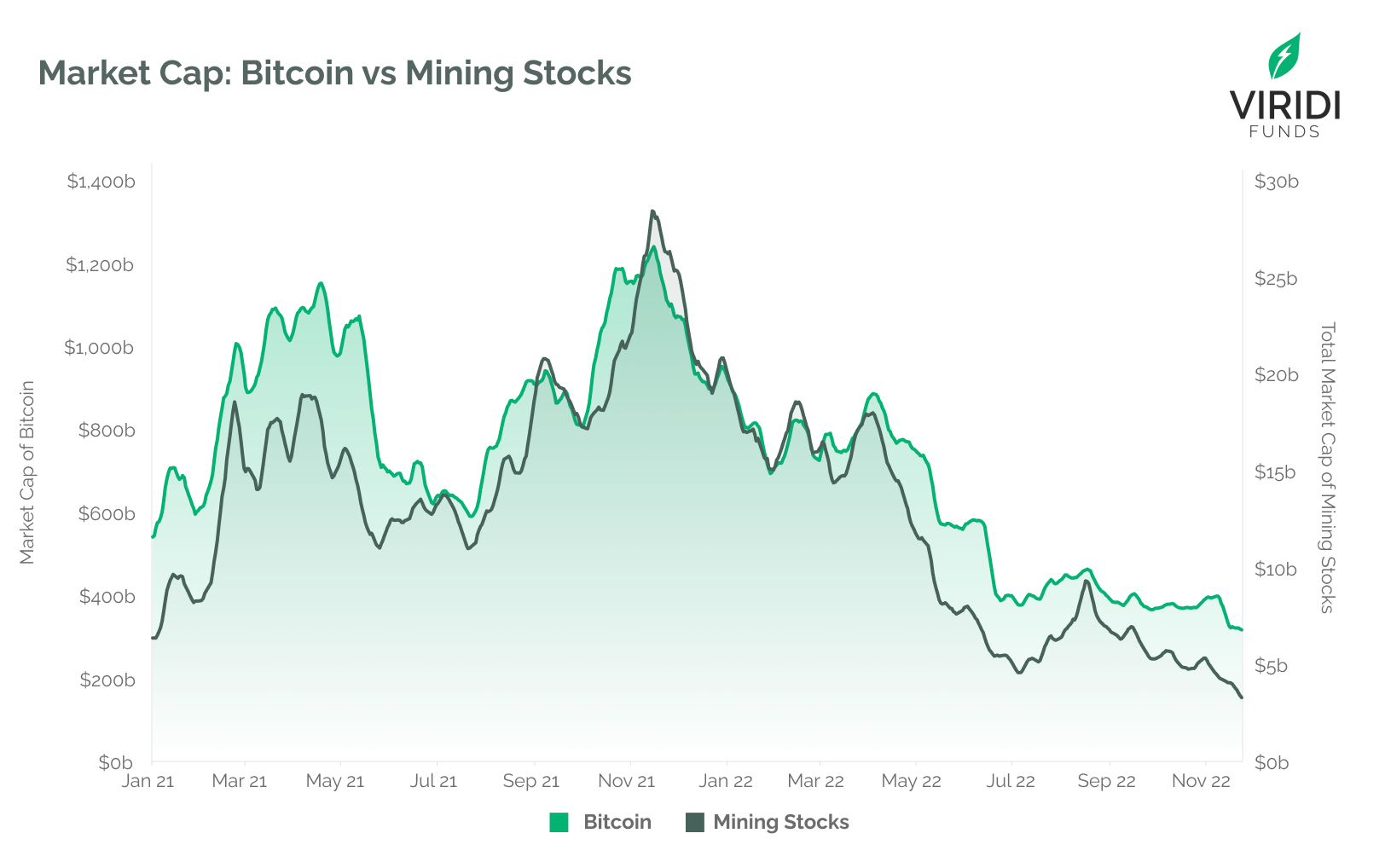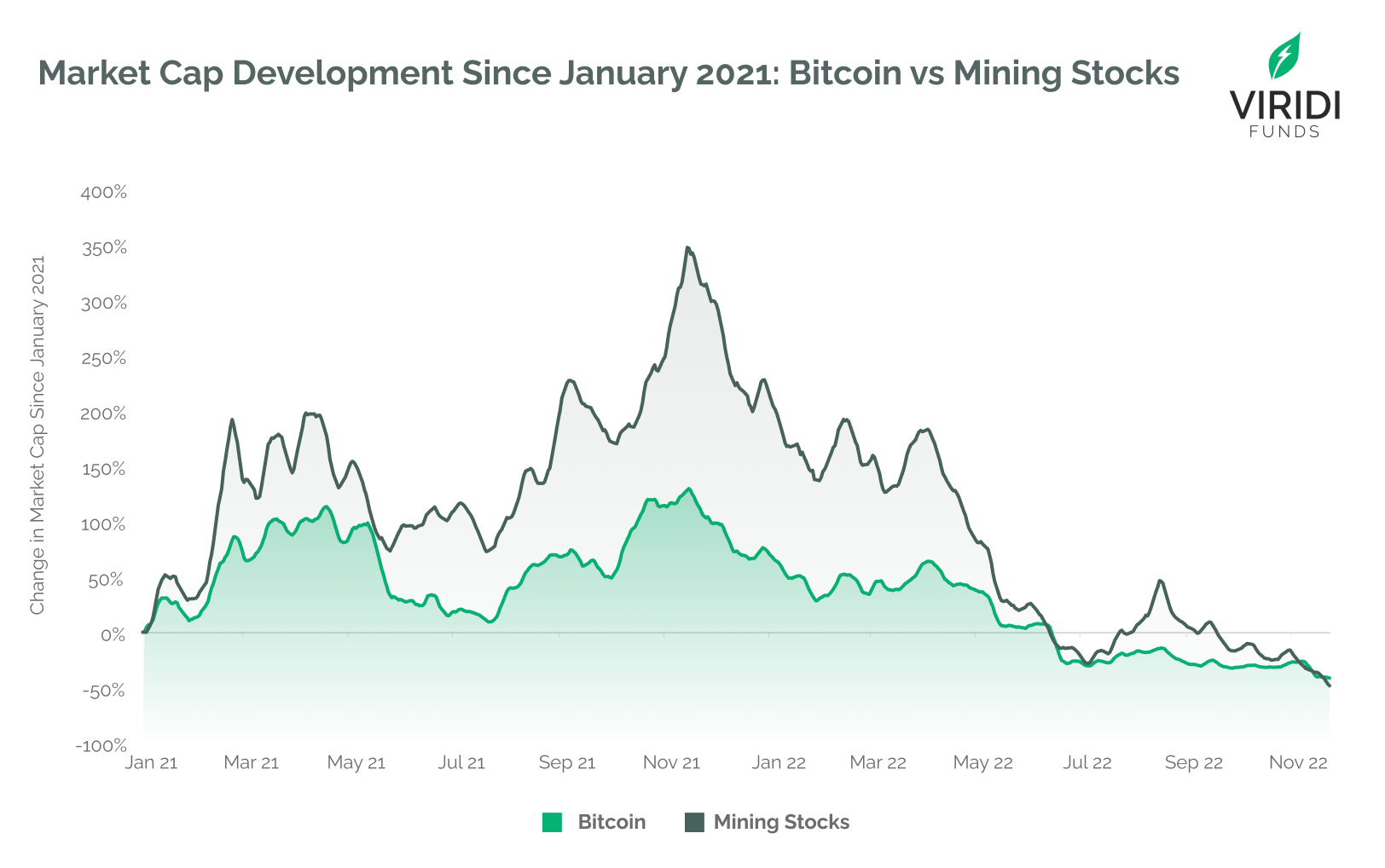 While the previous chart showed us the absolute change in market cap, the chart above shows the relative change from January 2021. At its peak in November 2021, bitcoin's market cap had increased by 130%. During the same period, the total market cap of mining stocks surged by 350%. This divergence tells us that although mining investors experienced some dilution on the way, holding mining stocks during the bull run was more favorable than owning bitcoin.